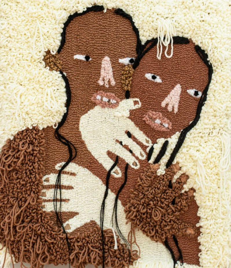 Employing rug-hooking and embroidery techniques, Paintsil creates playful figurative tapestries that celebrate craft as an art form that exists beyond antiquated ideas of ‘women’s work’. This particular piece depicts two figures in an embrace, symbolising the spirit of sisterhood and community.