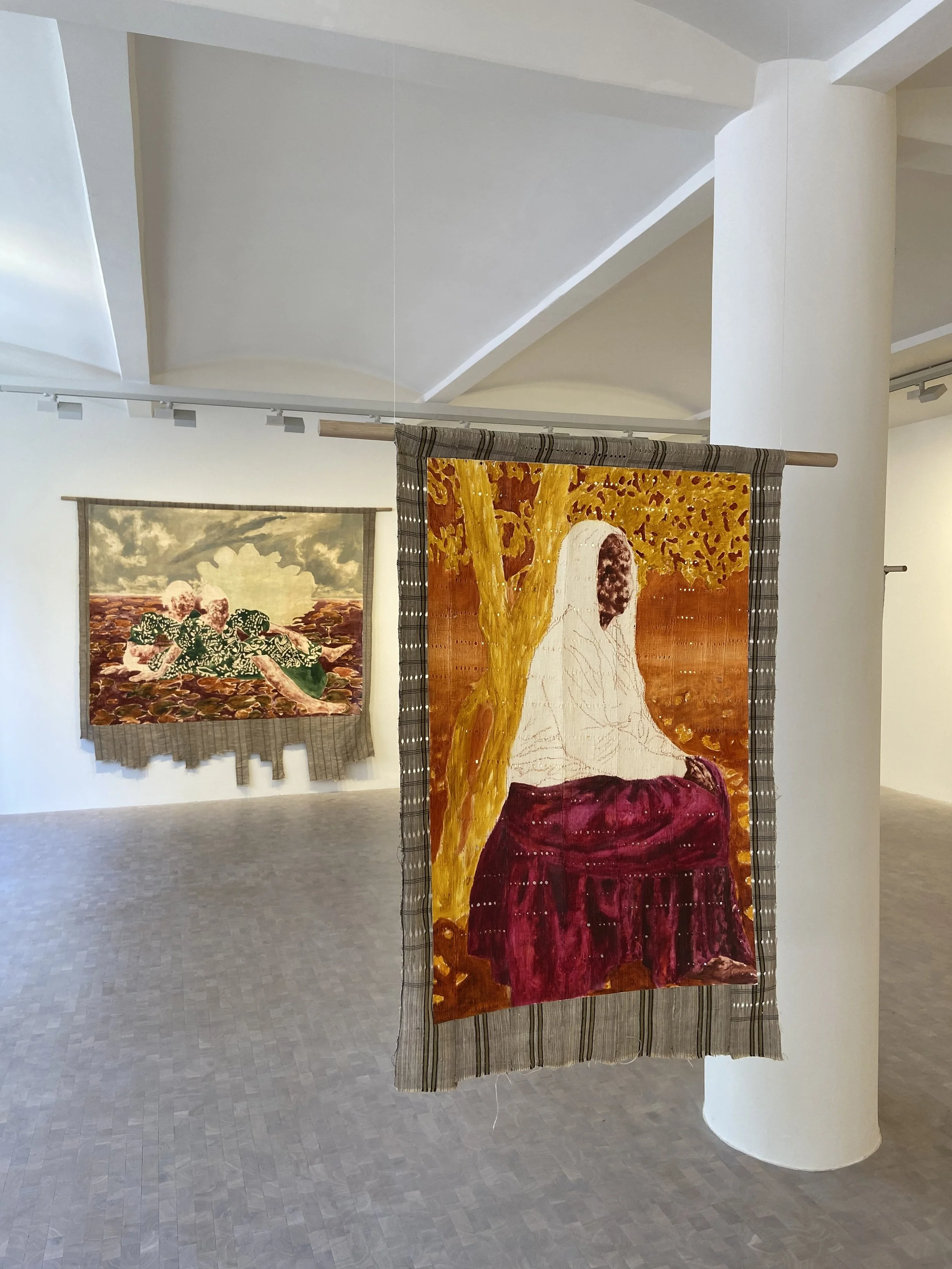 Lastly, one of my absolute favourite shows this month has to be Parables of Joy. This is Lagos-based artist Nengi Omuku’s first solo show with Pippy Houldsworth Gallery and her works are honestly amazing. Figuration and abstraction collide in Omuku’s works, echoing her complex narratives of culture and belonging. The gallery space is filled with lots of natural light and a few of the works are suspended from the ceiling using thin wires, allowing them appear as if they’re floating. Applying oil paint to sanyan – a traditional Nigerian fabric normally used for draped clothing, Omuku creates ethereal textile works that explore her cultural heritage and identity.