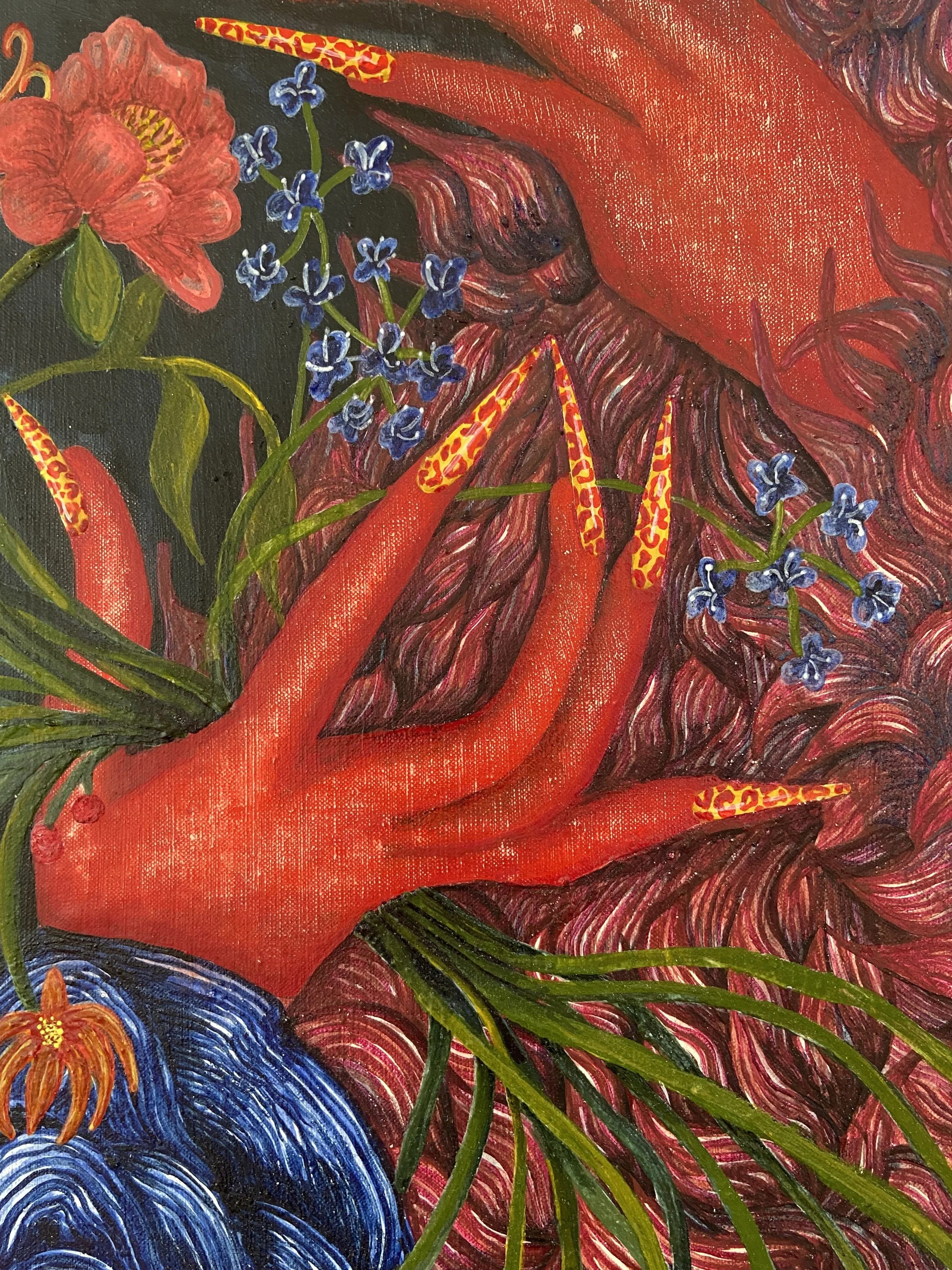 I first saw Nell Brookfield’s work last winter at Eve Leibe Gallery and I was blown away by the detail and vibrant patterns present in each painting. This month, the young artist returns with a solo show at Niru Ratnam Gallery, presenting a series of fresh works. There is a sense of continuity, as Brookfield’s compositions are punctuated by recurring motifs of red hands, dark tendrils, and cropped scenes depicting social gatherings. Bathed in rich texture, each moment appears almost frozen in time. In what can only be described as an eerie body of work, Brookfield’s new paintings are pleasantly unsettling.