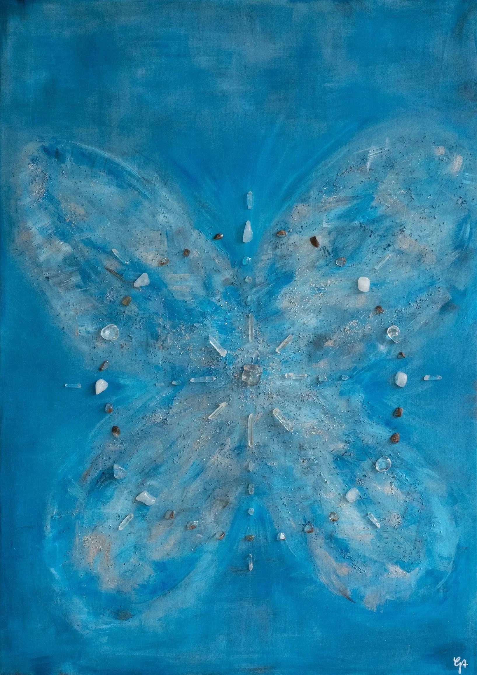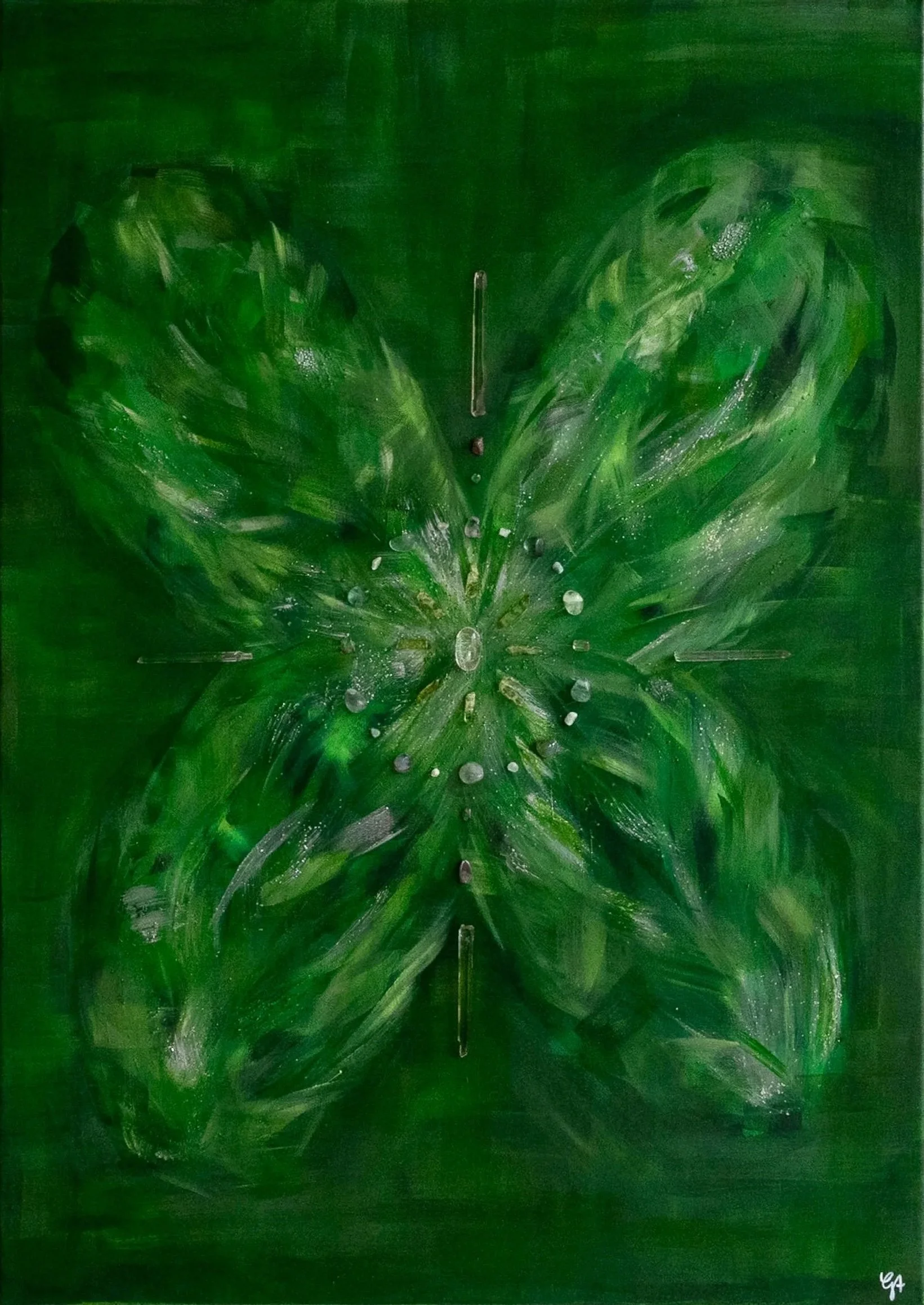 Once my crystals are prepped, I can get to work. I do a lot of research in my sketchbook, noting down ideas for colour combinations to experiment with later, sketching, and journaling. I enjoy both oil and acrylic; however, right now I’m in a phase where I’m using mostly acrylic. I’m feeling more energetic and therefore impatient at the moment, and I want to follow that momentum rather than restrict it. Painting with acrylic also allows me to use certain mediums to control clarity and texture. This is helpful as I work in layers and need that transparent quality to come through, especially when I’m incorporating crystal pigments into the actual paint.