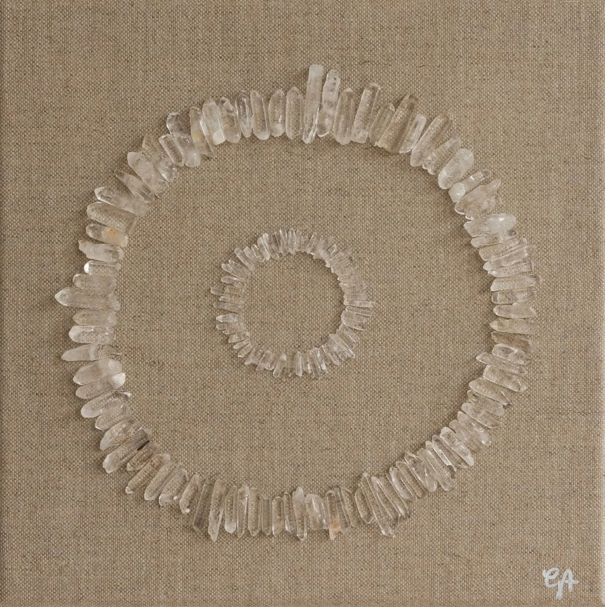 Geneva: I’m always looking for new ways of experimenting with different styles, so some of my pieces are a study of restraint. My salt circle series, for example, intentionally embeds quartz on raw linen, which brings more awareness to the crystals themselves. It plays with the idea of the ritual of sprinkling salt around the perimeter of your house as a means of spiritual protection and as a barrier preventing negative energies from entering.